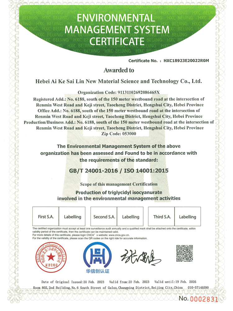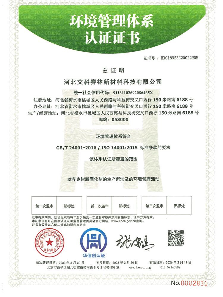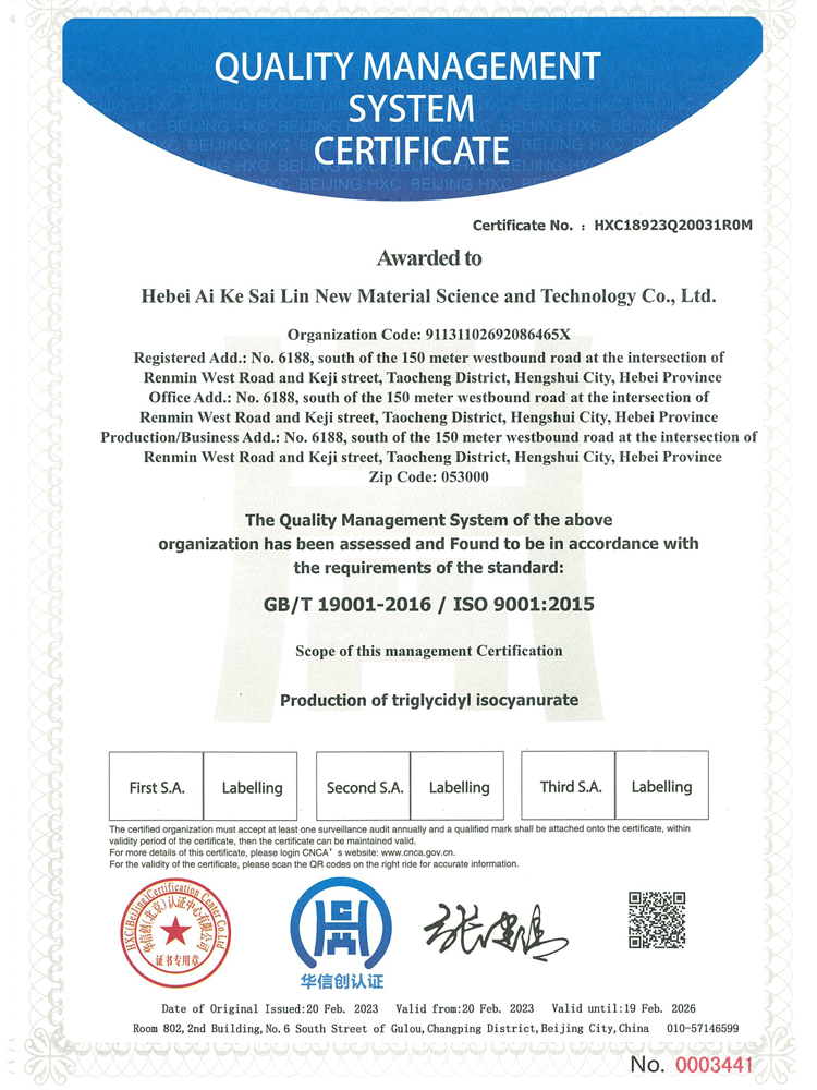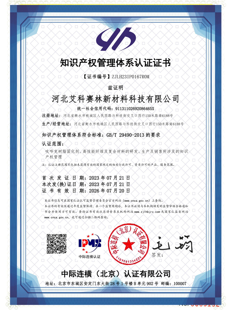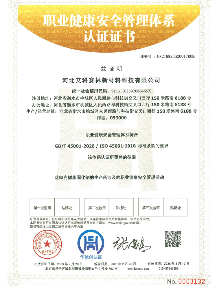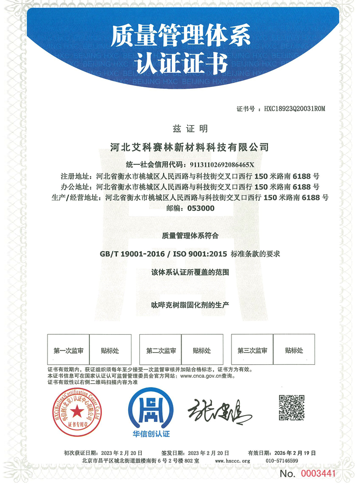 河北艾科賽林新材料科技有限公司成立于2009年,坐落在河北衡水桃城省級高新技術產業園區,占地100畝,注冊資金2500萬元,是一家以粉末涂料固化劑及高性能特種材料研發(fā)、生產、銷售為一體的高新技術企業。在激烈的市場競爭中不斷壯大,產品憑借良好的信譽與精益求精的工藝,在市場中取得良譽和好評。公司已通過ISO9001質量管理體系,IS014001環(huán)境管理體系、ISO45001職業健康安全管理體系。公司被認定為“高新技術企業”,河北省“專精特新”中小企業,先后獲得河北省行業“技術創(chuàng)新先進企業”,桃城“校企合作創(chuàng)新優(yōu)秀企業”、畝均“納稅貢獻先進企業”等榮譽稱號......